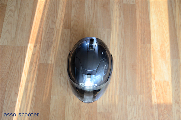 Le levier est placé sur le dessus du casque, plutôt sur l’arrière malheureusement. Malheureusement car cette position oblige à lever exagérément le bras. C’est regrettable car c’est du temps en moins sur le guidon pour la main gauche.