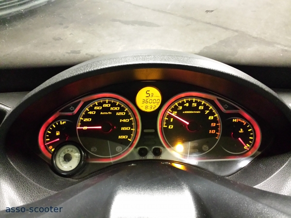 Deux gros compteurs à aiguilles, à gauche, le tachymètre, à droite le compte-tours. A l’extrême gauche, le niveau d’essence, et de l’autre côté, la température moteur. Au dessus, une fenêtre digitale qui indique la consommation d’essence, le kilométrage général et deux trips partiels, l’heure.