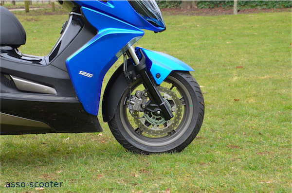 Si l’ensemble châssis-moteur-suspensions concourt à faire du Kymco K-Xct 125i un scooter sportif et joueur, la direction avec ses tubes de fourche de 30mm de diamètre vient tempérer les ardeurs joueuses du pilote. Ce qui lui manque, c’est un peu de vivacité pour que le tableau soit parfait.