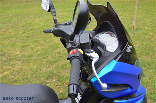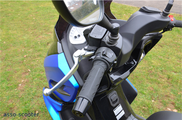 Les poignées de freins sont toujours réglables, ce qui est rare sur un 125cc et mérite d’être souligné. Au commodo droit, warning, coupe-circuit, mise en marche des veilleuses et code, démarreur. Normalement, les codes doivent s’allumer automatiquement mais le contacteur vous permettra d’économiser de la batterie en éteignant les feux au démarrage.