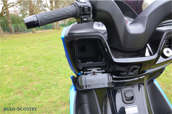 Le contacteur a été déplacé sur la droite. Il comporte un volet anti-effraction et est multi-fonctions. La clé de contact est articulée pour gagner quelques millimètres et permettre aux plus grands de ne pas heurter la clé avec leur genou. De l’autre côté, une boite gants avec prise allume-cigare permettra de ranger une petite bouteille d’eau. Le volet de cette boite gants a une cinétique surprenante. Il bascule d’avant en arrière comme les autres mais glisse également sur le plan horizontal.