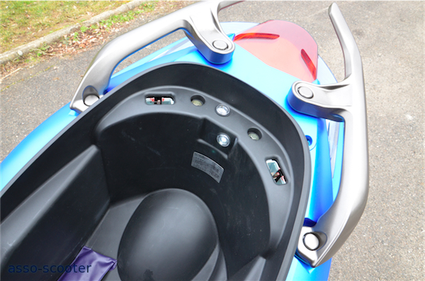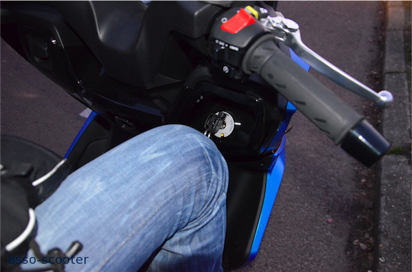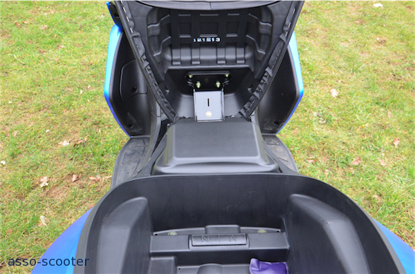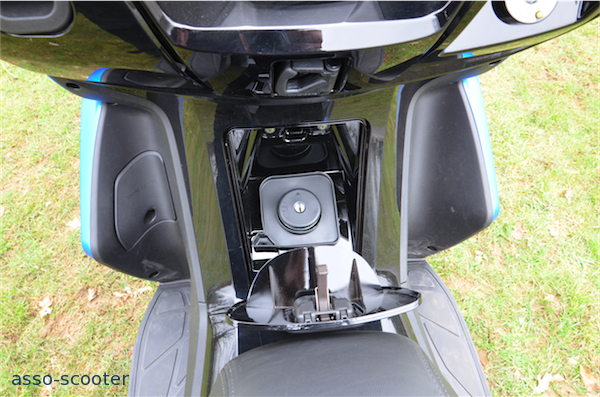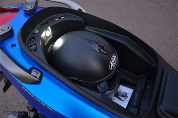 Nous l’avions signalé, le coffre perd de sa capacité de chargement. Un seul casque entrera. Un casque de taille XL tient dans le coffre et laisse encore un peu de place pour quelques affaires. On pourra se consoler en remarquant que la led éclairant le coffre est maintenant située en hauteur et remplit désormais son office.