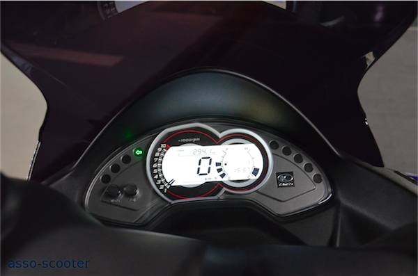 En s’installant au poste de conduite, la première surprise est que le tableau de bord étant entièrement électronique, il faut mettre le contact pour le voir s’illuminer et communiquer avec vous. A gauche, compte-tours à segments. Le tachymètre s’affiche en gros chiffres sur le centre. Le choix d’un compte-tours à segments est toujours discutable car manquant de précision. Les mille tours sont signalés par deux marques et il faut vraiment lire le compteur pour savoir à quel régime tourne le moteur. Heureusement, sur le Kymco K-Xct 125i les indications sont écrites en gros mais c’est moins pratique qu’un compteur à aiguille.