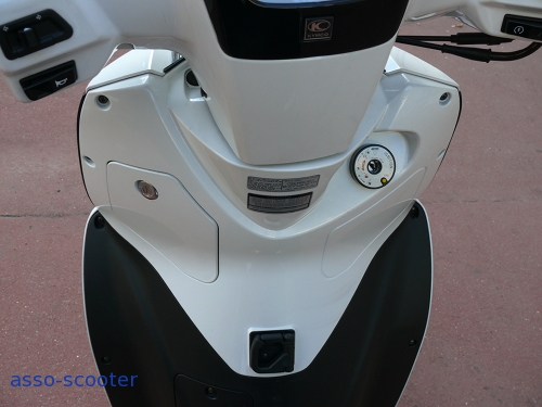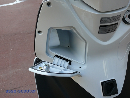 Plus bas sur le tablier, un espace de rangement fermant à clé est prévu. Il permettra de ranger des gants et une carte car il est suffisamment profond et large. Du côté droit, le barillet de clé de contact est multi-fonctions et est pourvue d’un volet anti-effraction. Entre les deux, un anneau accroche-sac.