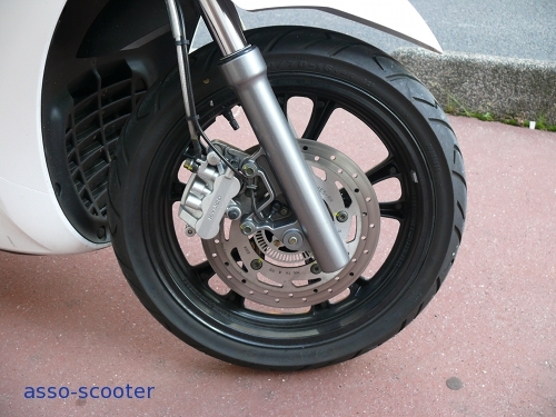 Kymco n’ pas lésiné pour stopper son People 125cc GTI. Deux disques de 260mm pour l’avant et l’arrière, le Kymco People 125cc GTI freine bien et fort. A noter que comme sur le Dink Street à sa sortie, ce qui semble être un capteur Abs est monté d’origine.