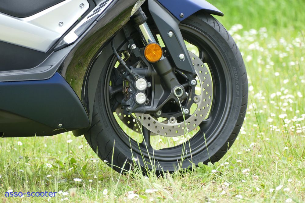 Les freins Yamaha sont réputés pour être efficaces et sur le T-Max, ils ne dérogent pas à la règle. Avec deux disques de 267mm de diamètre à l’avant, un disque de 267mm de diamètre à l’arrière, un poids roulant contenu, le T-Max est bon freineur.