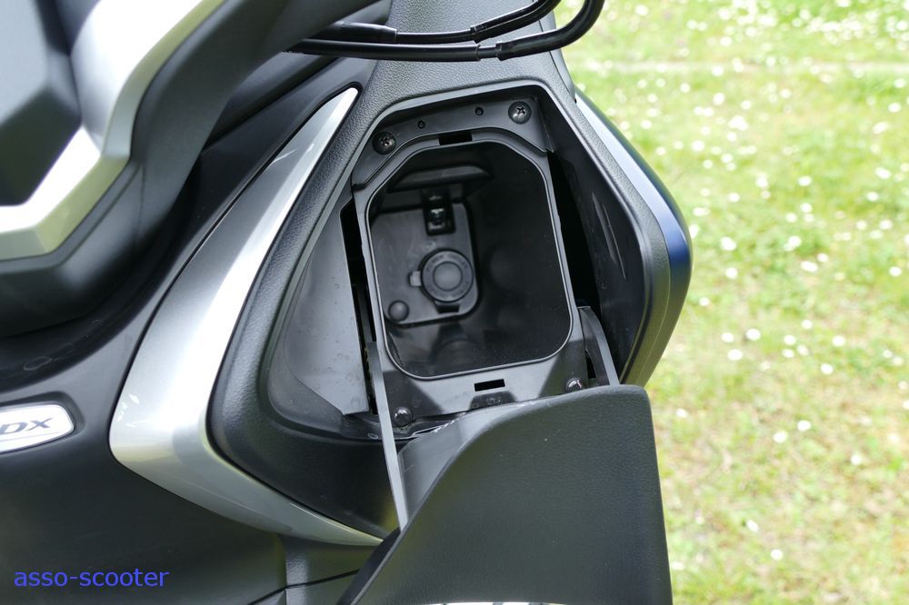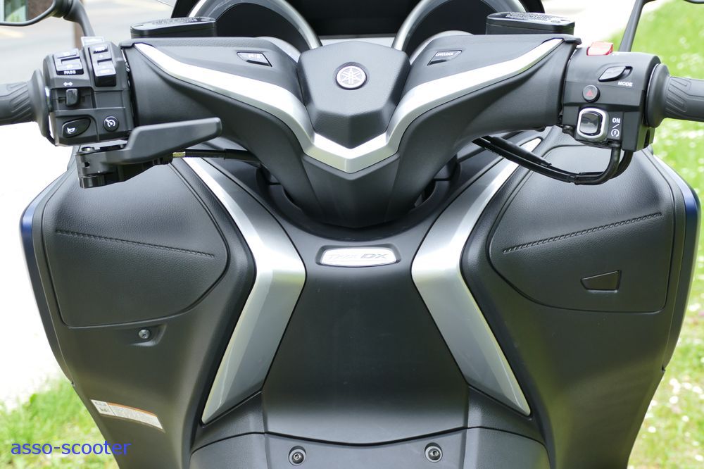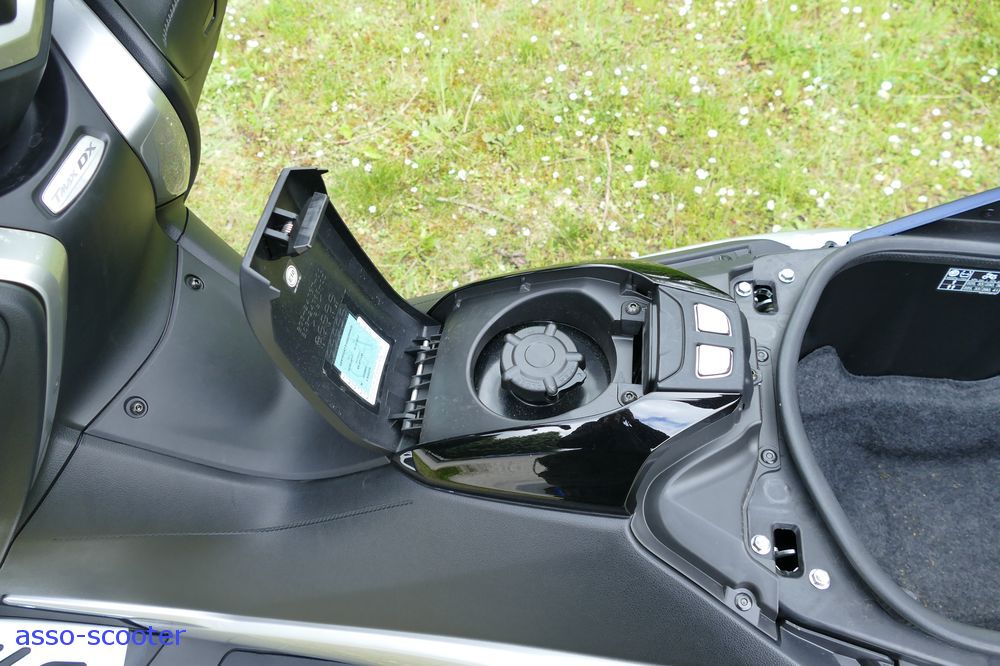 La version 2017 se pare d’inserts façon aluminium sur les compteurs, sur la base du tableau du guidon, du tablier. Le bouton du démarreur est également cerclé de cette façon. Des inserts façon aluminium agrémentent ainsi l’habillage du DX. Le plastique du poste de pilotage sous un certain angle rappelle l’aspect du cuir. Entre aluminium et cuir, c’est très bien vu et valorisant pour le propriétaire du scooter.