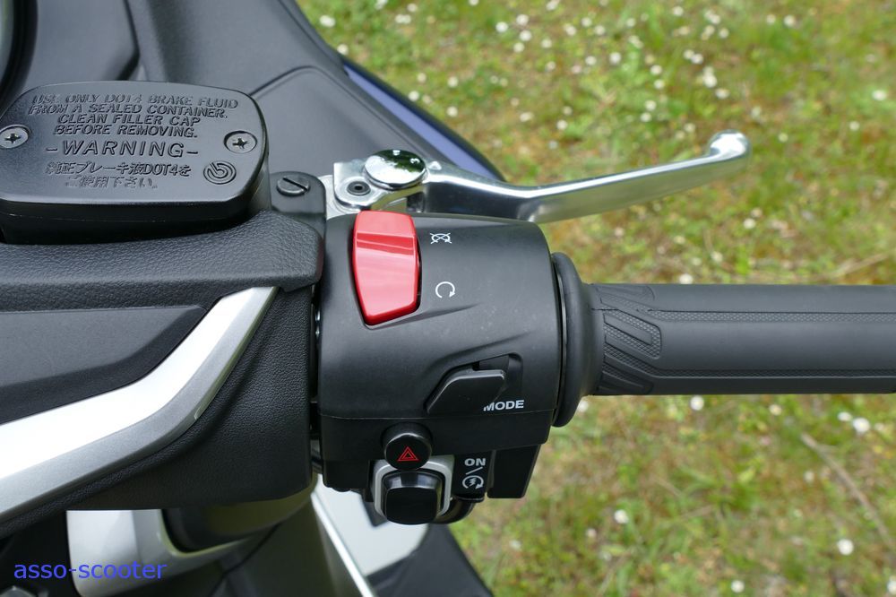 A gauche, le commodo est séparé en deux zones. Sur la première, vous avez, en plus des traditionnels boutons de basculement code-phare, les clignotants et le klaxon. Sur la seconde zone, vous avez le bouton qui permet de sélectionner la fonction, pare-brise, poignées, assise, et leurs réglages et enfin, le régulateur de vitesse. Les leviers de frein sont toujours réglables.