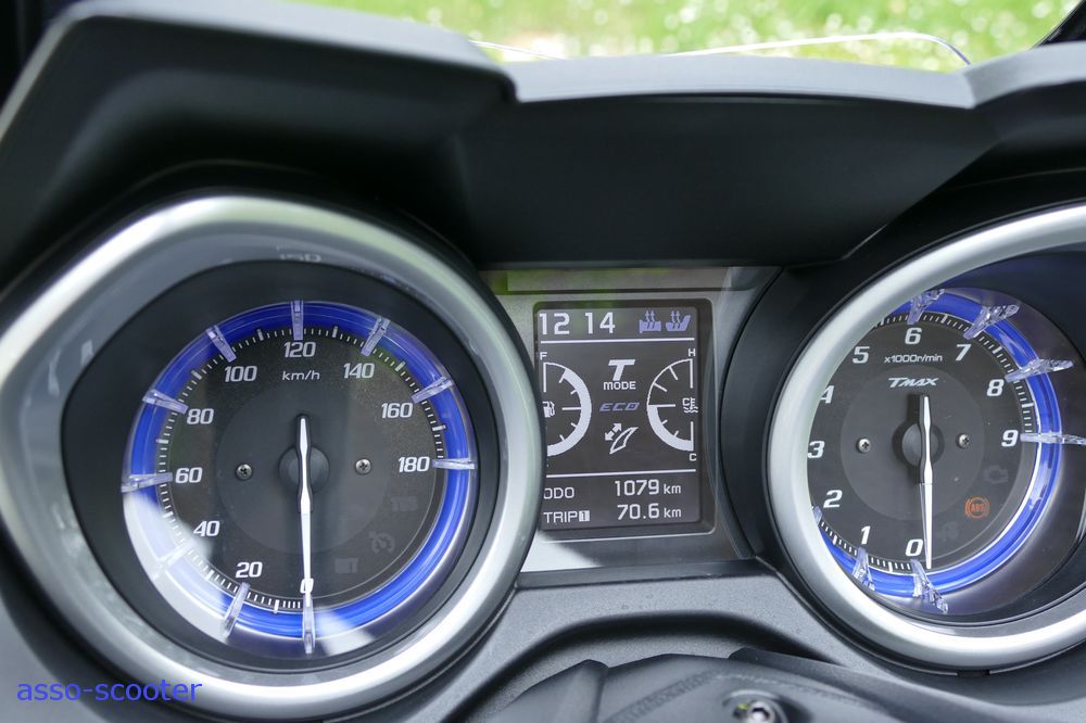 Au tableau de bord, Yamaha est resté fidèle aux aiguilles pour l’affichage. Sur le cadran de gauche, vous pourrez lire la vitesse et sur celui de droite, le régime moteur. Entre les deux, une fenêtre digitale afficher l’heure, le degré de chauffe des poignées ou de la selle. Vous y verrez également le niveau d’essence et la température moteur, le mode Sport ou Touring qui a été sélectionné, la température, les deux trips partiels, le général, la consommation moyenne, instantanée, la température... Un voyant « Eco » vous signalera une conduite « raisonnable ». Le TCS, Traction Control System, permet d’éviter tout dérapage au démarrage. Il est débrayable.