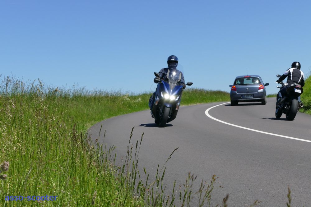 Sur route et aidé en cela par ses 216kg tous plein faits, vous serez surpris des possibilités qui s’ouvrent à vous. Le train avant est toujours aussi précis et vif. La mise sur l’angle se fait presque « naturellement ». Il suffit de porter son regard là où vous souhaitez passer et le T-Max suit. Impossible de prendre le châssis et les suspensions en défaut et c’est même le T-Max qui rattrapera les petits défauts de votre conduite. En virage et sur l’angle, un pincement des plaquettes ne le relèvera pas.