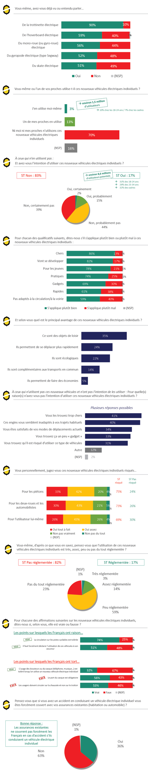 D’ailleurs, les Français sont très nombreux à penser que ces nouveaux véhicules vont se développer (82% le pensent). Si 69% d’entre eux assimilent ces objets à des « gadgets » et 78% estiment qu’ils sont surtout destinés aux jeunes, ils les perçoivent plutôt d’un bon œil estimant qu’ils sont pratiques (74%) et rapides (61%).