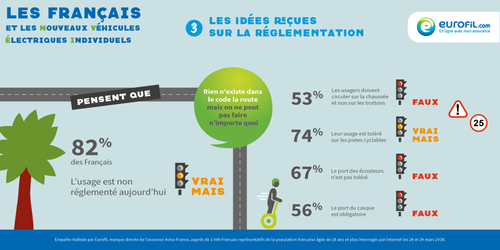 Les Français connaissent globalement mal les règles applicables à l’usage de ces véhicules. 82 % estiment que l’utilisation de ces nouveaux modes de déplacement électriques est peu voire pas du tout réglementée. Ils n’ont pas tout à fait tort : le code de la route ne contient pas explicitement de règles sur les NVEI. Mais l’usage a fini par les assimiler, la plupart du temps à des piétons qui doivent donc se déplacer à une allure modérée. 67 % des Français ont tort de penser que l’usage des écouteurs ou du casque (téléphone, musique...) est prohibé, ce n’est pas le cas.