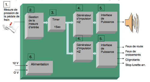4. Le timer (minuteur) envoie grâce à un générateur d’impulsion hertzien un signal pour modifier la fréquence d’alimentation des avertisseurs sonores en même temps qu’il envoie une autre fréquence aux différents systèmes lumineux (phares avant, arrières...). Ces fréquences sont ensuite envoyées à l’interface de puissance.