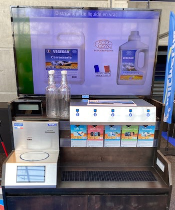Distribution des produits de la Marque Vegecar (produits d’entretiens Auto à base de tensio-actifs 100 % d’origine naturelle) avec une machine à distribution de Vrac, 5 becs qui permet :