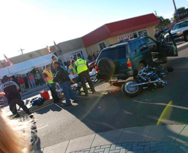 Par exemple, lorsqu’un crétin en 4x4 confond accélérateur et pédale de frein en bas de Main Street en pleine après-midi au milieu de 8 milliards de motos, ça te donne le joli strike suivant (deux motos au sol : une Electra écrasée sous la voiture – on ne la voit pas - et une Dyna. Deux blessés légers). Très grand professionnalisme donc, le tout dans un calme olympien.