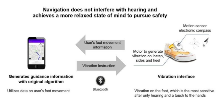 Ashirase est un système de navigation comprenant une application pour smartphone et un dispositif de vibration tridimensionnel ; celui-ci incorpore un capteur de mouvement qui est fixé à l’intérieur de la chaussure.
