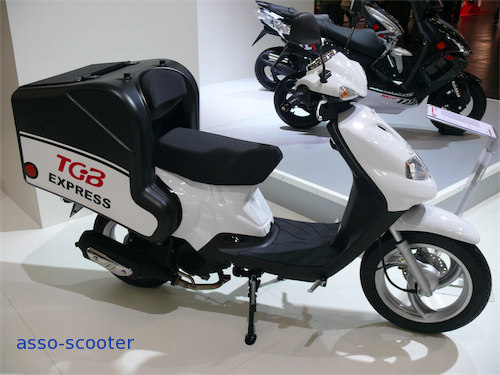 Express, le coffre devient géant. Ses 150 litres de contenance engloutiront tout le matériel voulu. Le TGB Express existe en 50cc et en 125cc. Béquille latérale des deux côtés, le TGB Express dispose de repose-pieds pour le pilote. TGB a prévu que l’espace dégagé par le plancher plat pouvait servir à augmenter la capacité d’emport.
