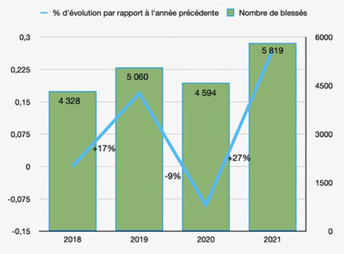 En 4 ans, le nombre de blessés a augmenté de plus de 34% ! Nous sommes passés de 4.328 victimes d’accidents vélo en 2018 à 5.819 en 2021.