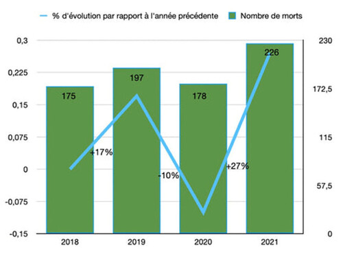 Sur près de 6000 victimes par an, 2021 a également été une année record dans un autre domaine ; celui du nombre de morts en vélo. Avec 226 décès, c’est la première fois de l’histoire que la barre des 200 est franchie.