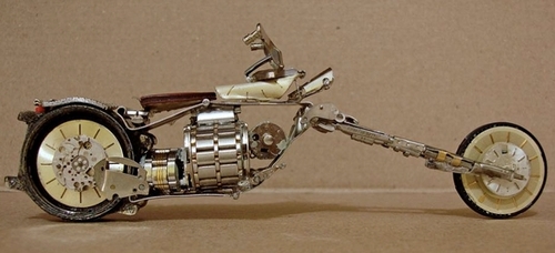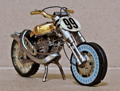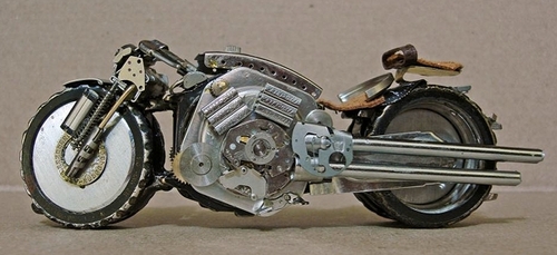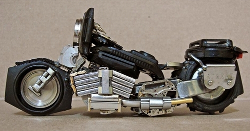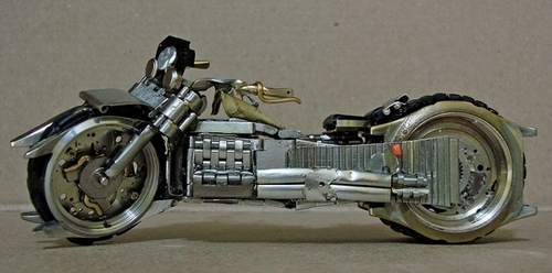 José Géraldo Rois Pfau s’inspire de motos réelles dont il trouve les photos sur internet. Force est de reconnaitre la minutie et la précision des assemblages.