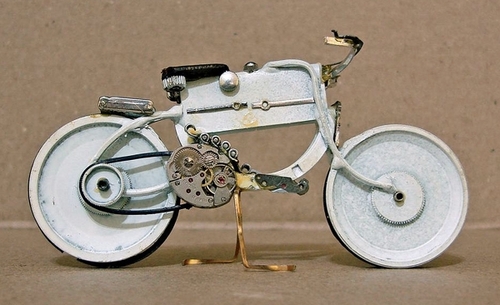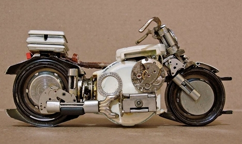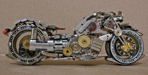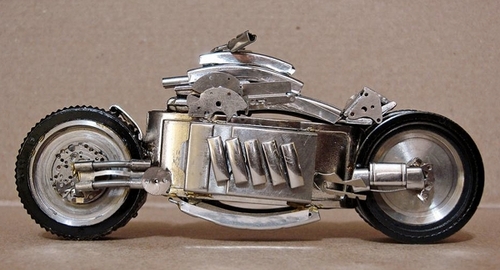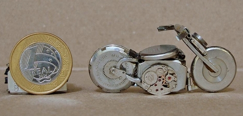 Avec de la colle transparente, José Géraldo Rois Pfau assemble les pièces pour créer des motos qui semblent plus vrai que nature. Métal, verre et également des matériaux nobles comme l’aluminium, l’argent, l’or sont utilisés.