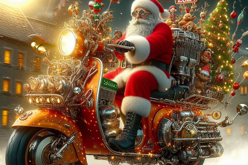 Notre Père Noël est à notre image : quand il aime, il ne compte pas. Son scooter doit développer pas loin de 1.000 CV, il doit être lourd à conduire, voire même inconduisible mais quand on aime, cela n’a pas d’importance. Il est bien sur son scoot comme nous le sommes.