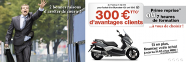 Cette fois, Mbk, en plus de l’offre de financement valable sur toute la gamme SKYCRUISER du 1er mars au 31 mai 2013, MBK ajoute 300€ d’avantages clients pour tout achat d’un Skycruiser 125 2013 avec ou sans ABS, et ce,