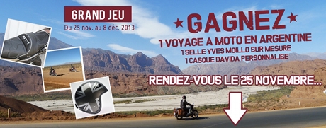 Durant le prochain salon de la moto de Paris qui ouvrira ses portes du 03 au 08 décembre, Mono 500, le spécialiste du voyage à moto dans les Andes, en partenariat avec la sellerie Yves Moillo et la boutique Vintage Motors Bastille, met en jeu un voyage à moto exceptionnel en Argentine, au guidon d’une moto de légende, la Royal Enfield 500cc. Ce voyage d’une valeur de 3.600€ constitue le premier prix.