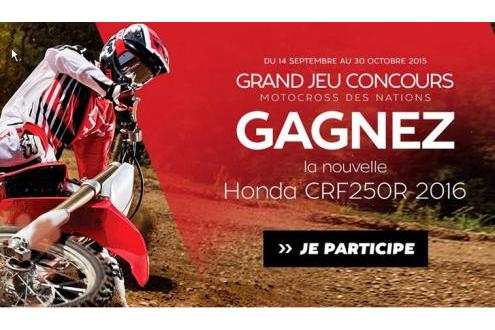 A l’occasion du Moto Cross des Nations, les 26 et 27 Septembre prochains, Motoblouz, partenaire de l’évènement et sponsor du Team SR Honda Motoblouz fait gagner la toute nouvelle Honda 250 CRF R 2016, tout juste sortie d’usine.