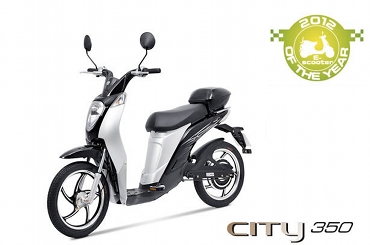 Le City 350 est un modèle plus urbain et plus léger en terme de poids. Il a été élu scooter Européen de l’année 2012 dans la catégorie e-vélomoteur 25. Le City 350 est disponible avec deux versions de batteries. La première est avec des batteries plomb-acide et la seconde avec des batteries au lithium. Dans les deux cas, la batterie est amovible pour une recharge plus aisée. Ses roues de 14’ lui permettront de se faufiler avec aisance en ville.