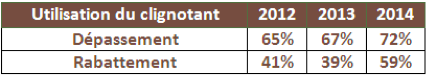 En 2014, plus de la moitié des conducteurs utilisent le clignotant pour signaler leur rabattement contre 1/3 en 2013. Quant aux dépassements, les 3⁄4 des automobilistes se servent maintenant du clignotant contre seulement 59% en 2013.