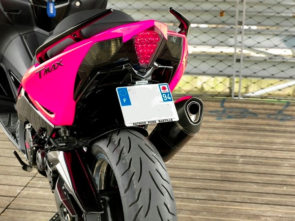 Côté équipements, le PinkMax s’appuie sur une visserie full black, un feu arrière noir, des clignotants fumés, un phare Angel Eyes Xentech, des jantes noires SMX avec bords larges polis miroir, trois disques de freins oversize 298 mm GALFER avec patte de déport, des plaquettes, un garde boue avant et leviers de frein Racing YAMAHA, ainsi qu’une ligne d’échappement AKRAPOVIC homologuée avec silencieux carbone court. Le frein de parking arrière a été supprimé et un étrier de Ph2 monté.
