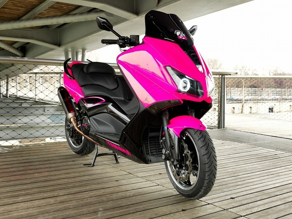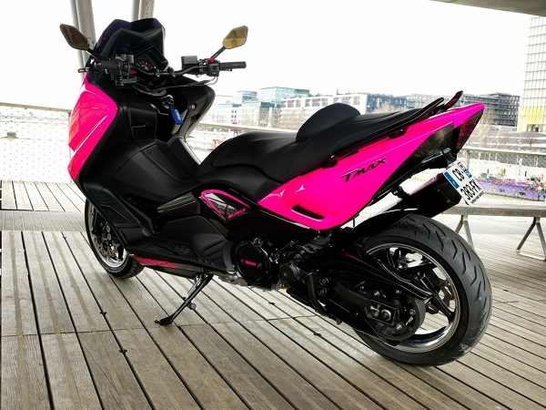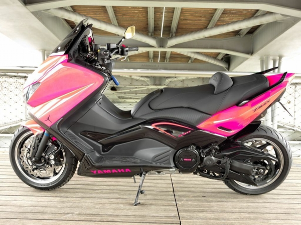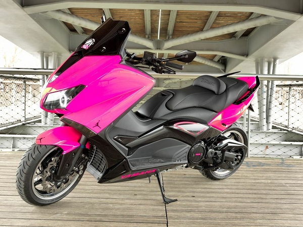 Enfin, pour se démarquer de ses homologues, ce T-Max peut également compter sur une bulle sport, une selle confort, des ressorts de fourche, un amortisseur arrière OHLINS, un guidon Naked avec embout de guidon, un capot de maître-cylindre, un levier de frein de parking, des rétroviseurs homologués, un bouchon d’huile RIZOMA, et enfin, un support de plaque homologué YAMAHA.