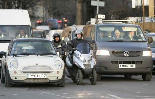 Devant moi, un T-Max qui s’était rangé à gauche débouche pour se remettre dans l’interfile. Pas de clignotant... Il fait beau, je freine et le laisse passer.