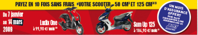 Le principe est un paiement du scooter en 10 fois sans frais. A ceci s’ajoute 1 mois d’assurance gratuite si vous souscrivez une assurance au moment de l’achat du scooter.