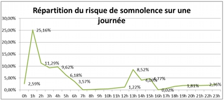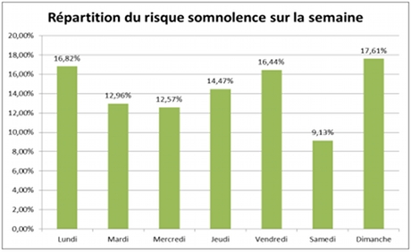 Il y a deux fois plus de risque de somnolence le dimanche que le samedi qui récolte 9% des alertes sur la semaine[1].