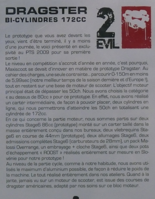 Le Maxiscoot Dragter va vous permettre d’abattre le 0-150 en moins de 6 secondes. Le Maxiscoot Dragter est même une exclusivité Pts 2009. Le Maxiscoot Dragter dispose d’une cylindrée de 172cc développant 50Cv ! C’est la puissance développée par des cylindrées approchant les 700-800cc.