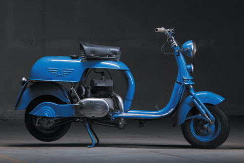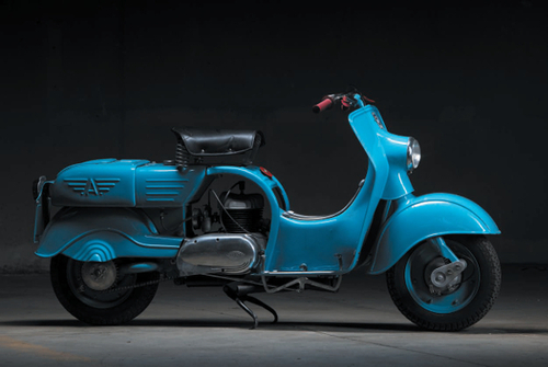 En 1950, la guerre commerciale bat son plein sur le marché des scooters. MV Agusta a conçu l’Ovunque. Il se caractérise par un cadre ouvert tubulaire, un moteur ≪ oscillant ≫ permettant de monter un seul ensemble ressort-amortisseur. Avec des roues de 8 pouces, il affiche un poids inférieur de 10 kg au modèle CGT de 1950. Propulse par un monocylindre deux temps de 125 cm3 à boite 3 vitesses, il pouvait atteindre une vitesse de 80 km/h. Produit à environ 10 000 exemplaires de 1951 à 1954, l’Ovunque reste difficile a trouver. Cette version de la première série (051), reconnaissable à son simple échappement, n’a jamais été utilisée depuis sa restauration.