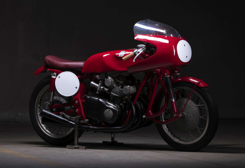 La 500 4 cylindres de la collection est une machine exceptionnelle. Il s’agit d’un assemblage composé en grande partie de pièces originales d’époque qui en font une moto d’une extrême rareté. Parmi celles-ci, il faut noter l’impressionnant ensemble Bloc cylindre et culasse, cette dernière coulée en une seule pièce (probablement la seule existante !) à la manière des Gilera 4 dessinées par Piero Remor. Les carburateur Dell’Orto SS ø 30 mm et la magnéto sont également des pièces d’époque, tout comme le frein avant à tambour double came, les roues Borrani, la suspension arrière, les amortisseurs arrière, le compte-tours, les repose-pieds, le guidon et la fourche avant (certaines parties de la fourche Earles ont été refaites par sécurité).