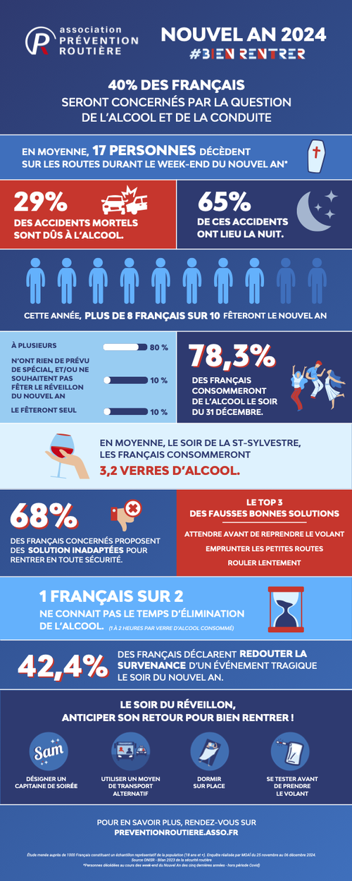 A la veille des festivités du Nouvel An, l’association Prévention Routière rappelle que 4 Français sur 10 (40 %) seront concernés par la question de l’alcool et de la conduite la nuit du réveillon pour eux-mêmes ou pour leur entourage.