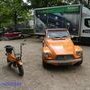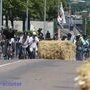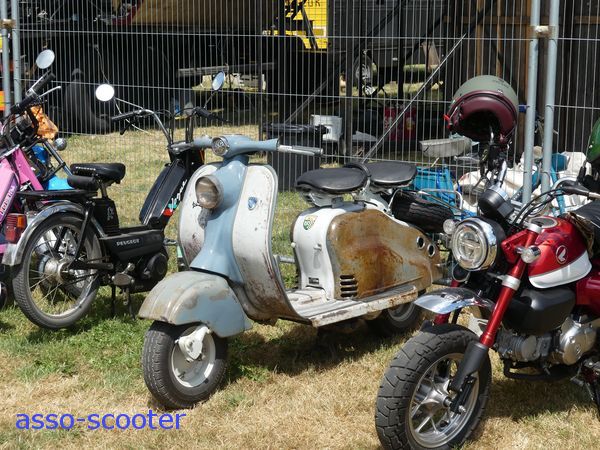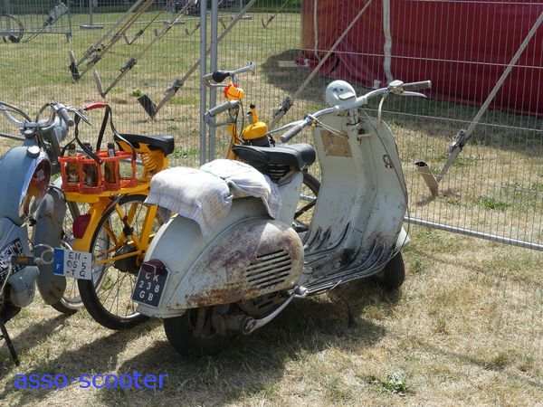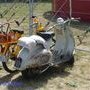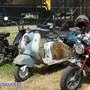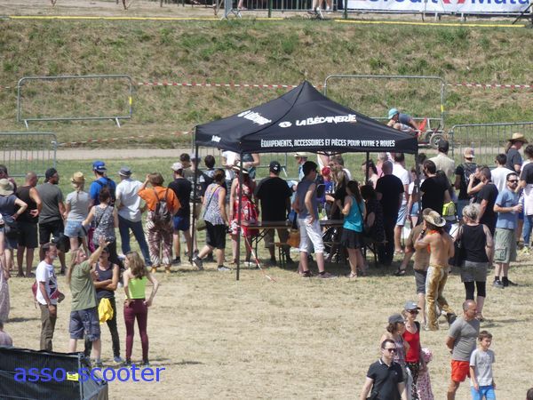 Cela commence par des bottes de foin qui délimite le terrain de jeu de Rock’a’bylette. L’entrée proprement dite est un plus loin. Ce n’est pas vraiment une entrée, juste une allée plantée de stands. Ce sont des exposants et des particuliers qui montrent leurs mobs, solex, vélos. Car ici, nous sommes au pays de la mob. Les 49.9 règnent en maîtres !