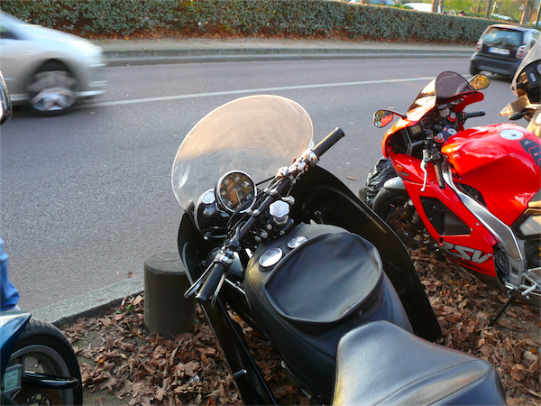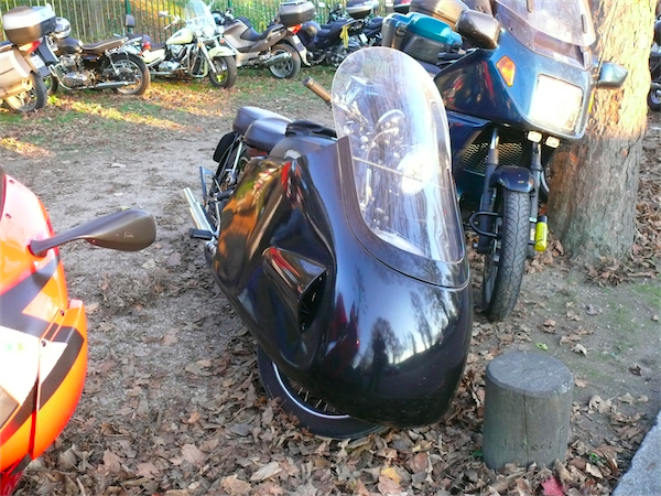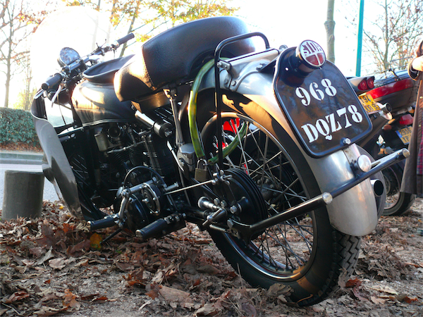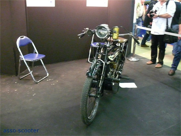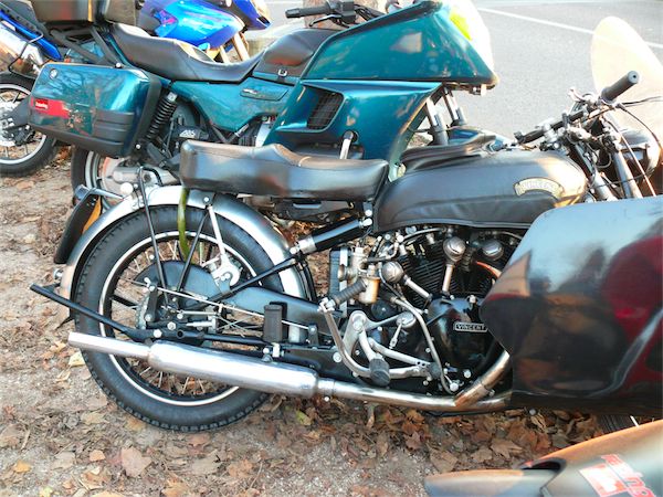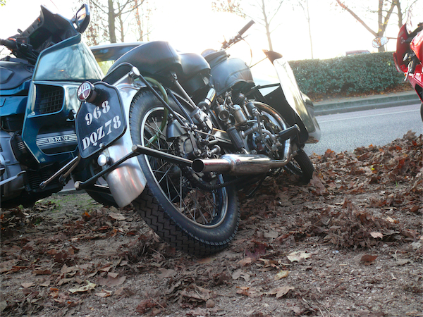 Il ne faut pas croire que sorti du salon, les pages de l’histoire se referment aussi sec. C’est oublier que le parking regorge de deux roues en tous genres. Des scooters, jeunes et vieux, et au hasard d’une place de parking, une Vincent, en parfait état de marche.