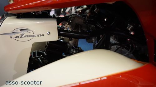 Lazareth a été sélectionné pour modifier la fouche. Un demi-disque de frein vient bloquer la Goldwing en position droite à l’arrêt. Au gudion, les commandes sont nombreuses pour actionner le mécanisme.