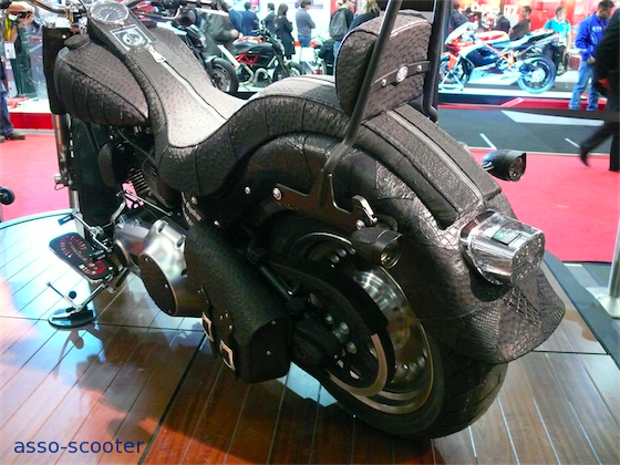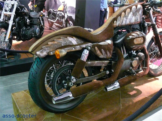 « Ce sont des machines habillées par Jean-Baptiste Reautureau. Il faisait dans la chaussure jusqu’à présent et roule en Harley Davidson et a eu l’envie d’habiller nos machines à sa sauce. La première en peau de python a nécessité plus de 800 heures de travail et plus d’un an.