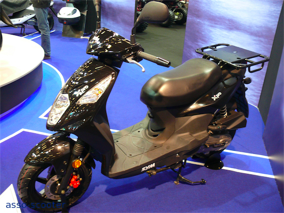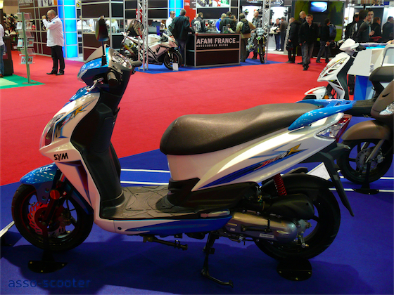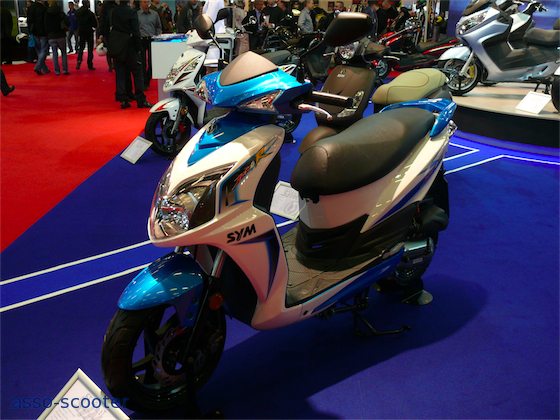 Sym présente sur son stand un 50cc aux lignes résolument sportives. Le tarif annoncé est de 1.499€. A ce tarif, vous aurez un démarreur électrique et au kick ainsi qu’un disque de frein à l’avant.