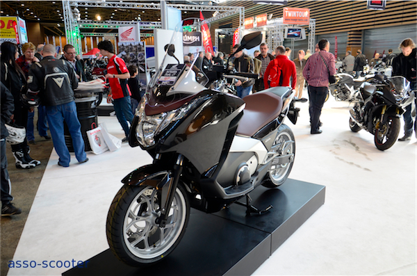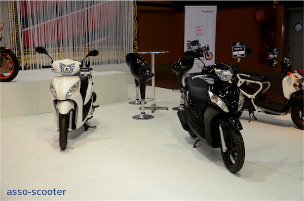 L’Integra faisait la jonction entre les scooters et les motos sur le stand Honda. Dans cette version noire et sa selle marron-lie de vin, l’Integra rend bien, surtout sans les valises. Les Vision étaient présents sur le stand, tout comme l’Innova et le Zoomer.