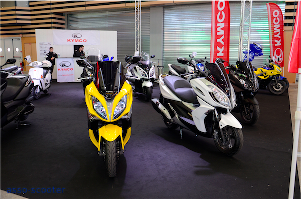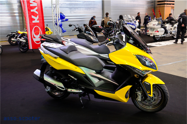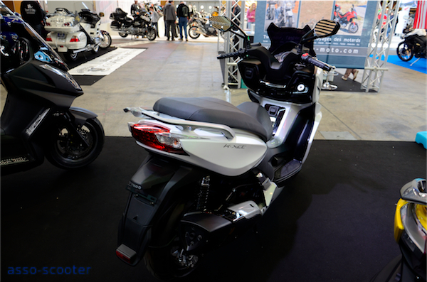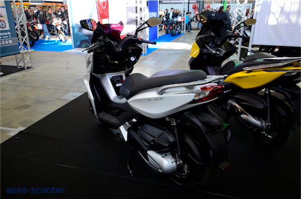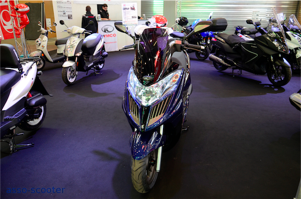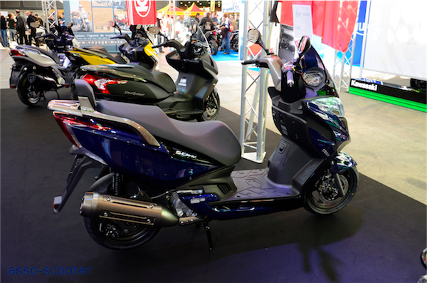 Sur le stand Kymco, le 400cc Exciting dans sa livrée jaune et noire est tel un félin, prêt à bondir et prendre la route. Le Dink Street était disponible dans une livrée noir mat et des protections repose-pieds façon aluminium, un pare-brise court et un pot Leo-Vince. Une personnalisation qui fleure bon le Sport.