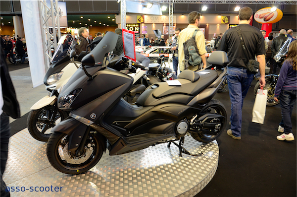 Chez Yamaha, les premiers avaient droit à une estrade. Le X-Max et le T-Max tronaient sur un plateau tournant. Dans sa livrée noire mate, le nouveau T-Max en jette, surtout avec son pare-brise court.