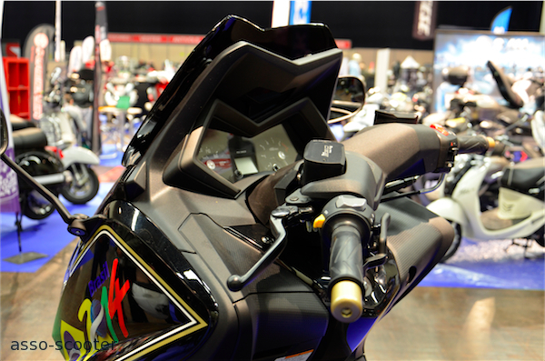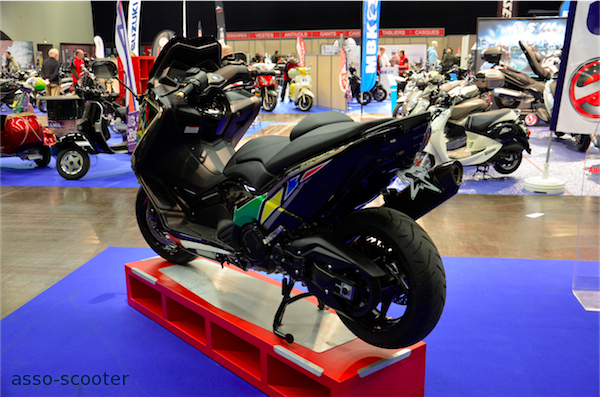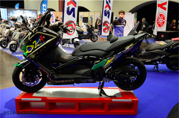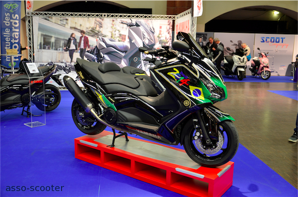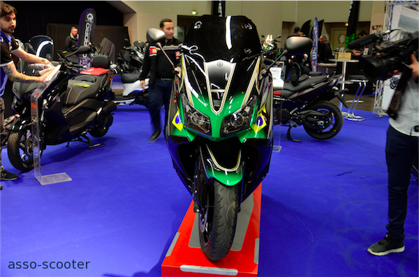 C’est Patrick Pons qui représente Yamaha au Salon du Scooter de Paris. Et avec un magnifique T-Max 530 aux couleurs du prochain Mondial de football. Même si le foot n’est pas votre tasse de thé, vous ne résisterez pas longtemps à l’appel du football, ou plus précisément de ce scooter retravaillé : pot Akrapovic, marche-pieds, peinture, feu arrière, nez... Les modifications font de ce T-Max 530 un modèle unique. Si vous avez « craqué », il faudra quelques 14.000€ pour qu’il soit vôtre.