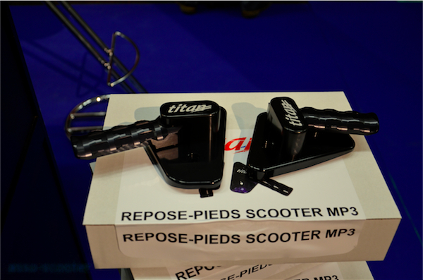 Cette société, spécialisée dans les accessoires motos, aborde le monde du scooter. Après avoir été sollicité à plusieurs reprises par des concessionnaires, Titan Innovation a développé un accessoire qui ravira tous les propriétaires de Mp3. Le repose-pieds de Titan Innovation s’adapte sur l’emplacement de l’encoche prévue pour le passager et offre un repose-pieds, rétractable, digne de ce nom. Vous n’aurez plus les pieds du passager qui viennent cogner contre mollet. Pour le passager, il pourra se caler sur ces repose-pieds et y prendre véritablement appui. Pour le salon, le prix est de 150€ contre 195€ habituellement.